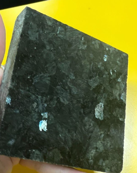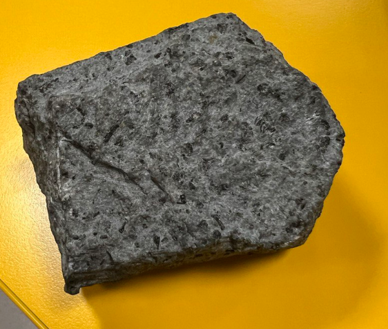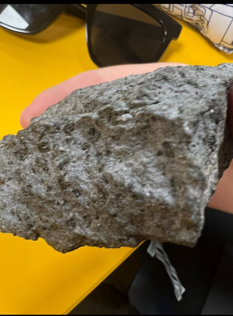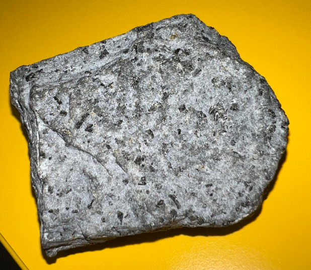 Come si può notare dalle foto sopra riportate, questa roccia è di colore grigio con tante “macchioline”, queste sono i minerali che possono essere di due colori: neri, chiamati “Pirosseni” appartenenti alla classe dei silicati contenenti magnesio, ferro e calcio; o verdi che prendono il nome di “Olivina” che vengono classificati come nesosilicati (particolare classe che assume una struttura cristallina composta da tetradi Z-O)