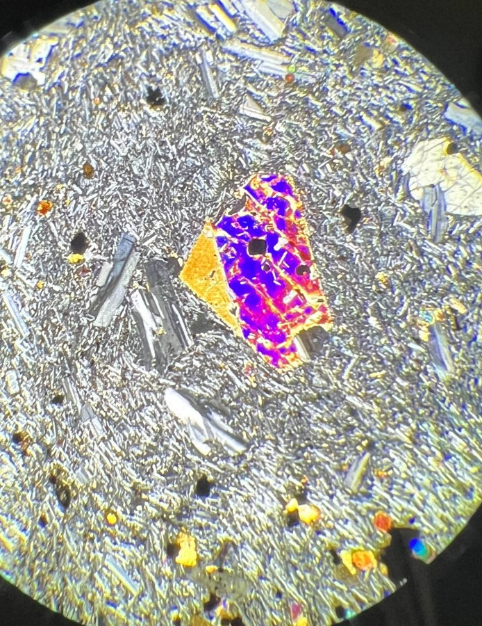 I basalti sono lave solidificate che vennero a giorno a temperature anche superiori ai 1000 gradi. Quando un vulcano erutta, i suoi prodotti sono sempre in parte liquidi, in parte solidi e in parte gassosi. Nella parte solida vi sono spesso cristalli di minerali che si formano a temperature persino più alte della lava che ha formato il basalto. Questi cristalli si sono formati ad una profondità di decine di chilometri dentro la crosta terrestre. Visti al microscopio questi grandi cristalli sono nitidi e presentano colori sgargianti. La parte liquida ci appare come un aggregato di cristalli piccolissimi, che in queste immagini fanno da contorno ai cristalli più grandi. Per gli studiosi questi micro-cristalli sono importantissimi, perché ci portano notizie da profondità che non possono essere esplorate direttamente.