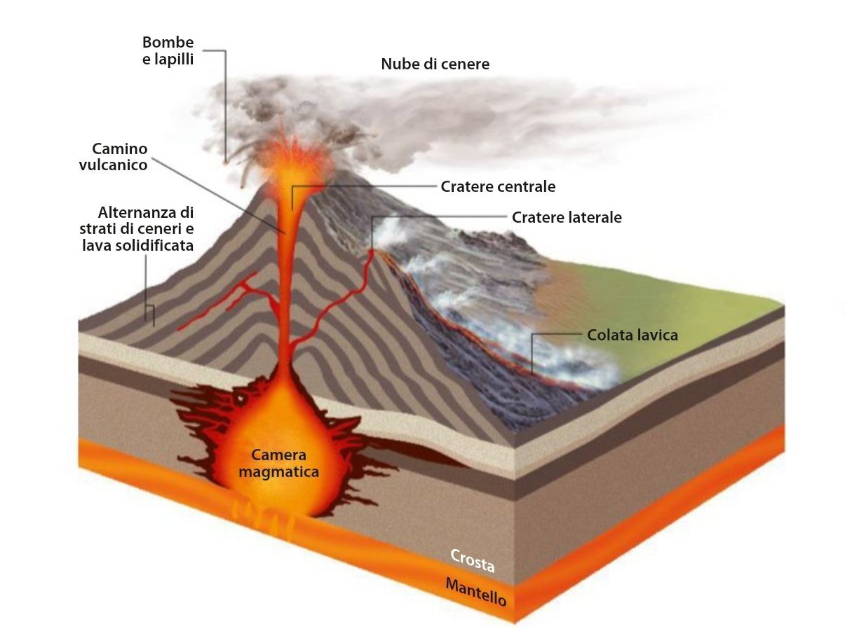 - il mantello, dove il magma si genera tramite la parziale fusione delle rocce circostanti.