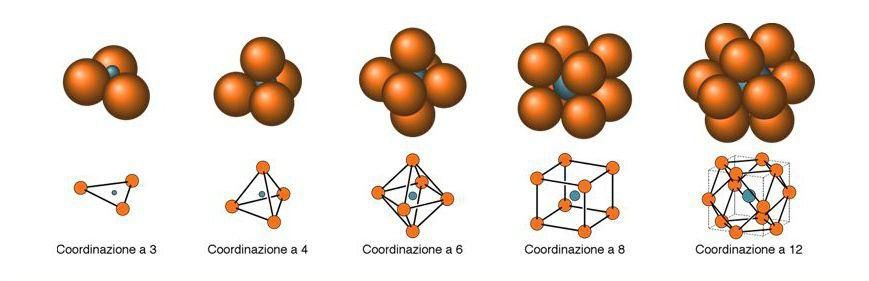 - Parametri fisici: le dimensioni delle specie chimiche che si combinano devono essere tali da poter costituire una struttura cristallina stabile. Le dimensioni relative degli ioni determinano la loro posizione nel reticolo cristallino; gli ioni tendono a disporsi in modo che la loro distanza sia minima a causa della reciproca attrazione. Se ioni positivi e negative hanno dimensioni diverse, intorno a quello piccolo (+) possono posizionarsi solo tre ioni (-) di dimensione maggiore; questa disposizione è detta coordinazione a tre.Se mano a mano la differenza di dimensione degli ioni positivi e negativi diminuisce, la coordinazione diventa a quattro, a sei, a otto e infine a dodici (dimensioni ioni quasi uguali).