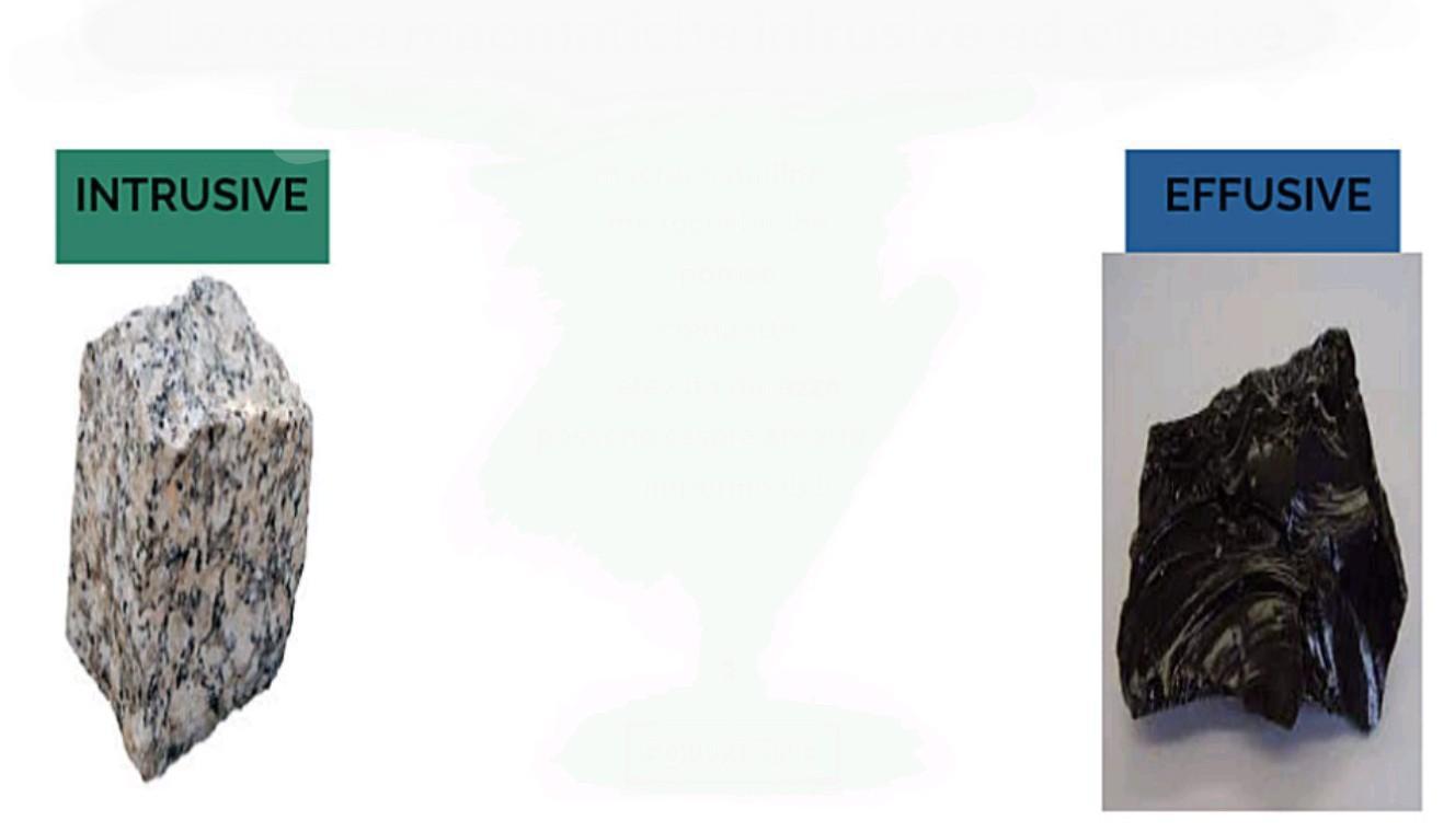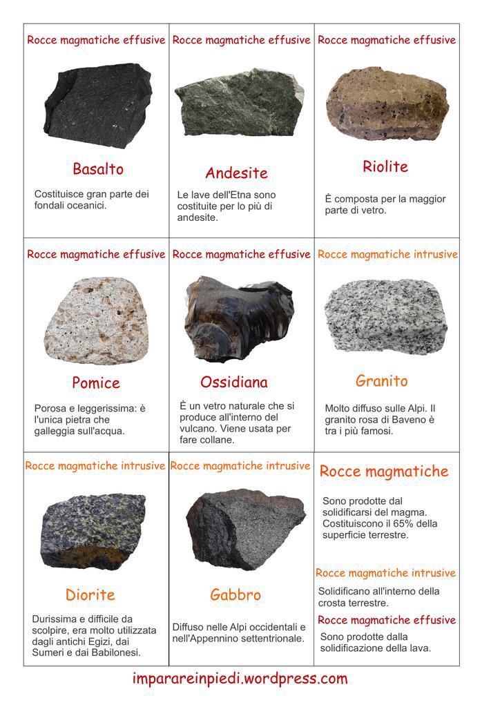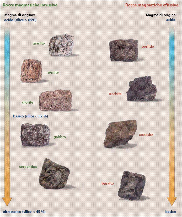 - le rocce magmatiche, divise in effusive (che derivano dalla solidificazione della lava) e intrusive (che derivano dalla solidificazione del magma);