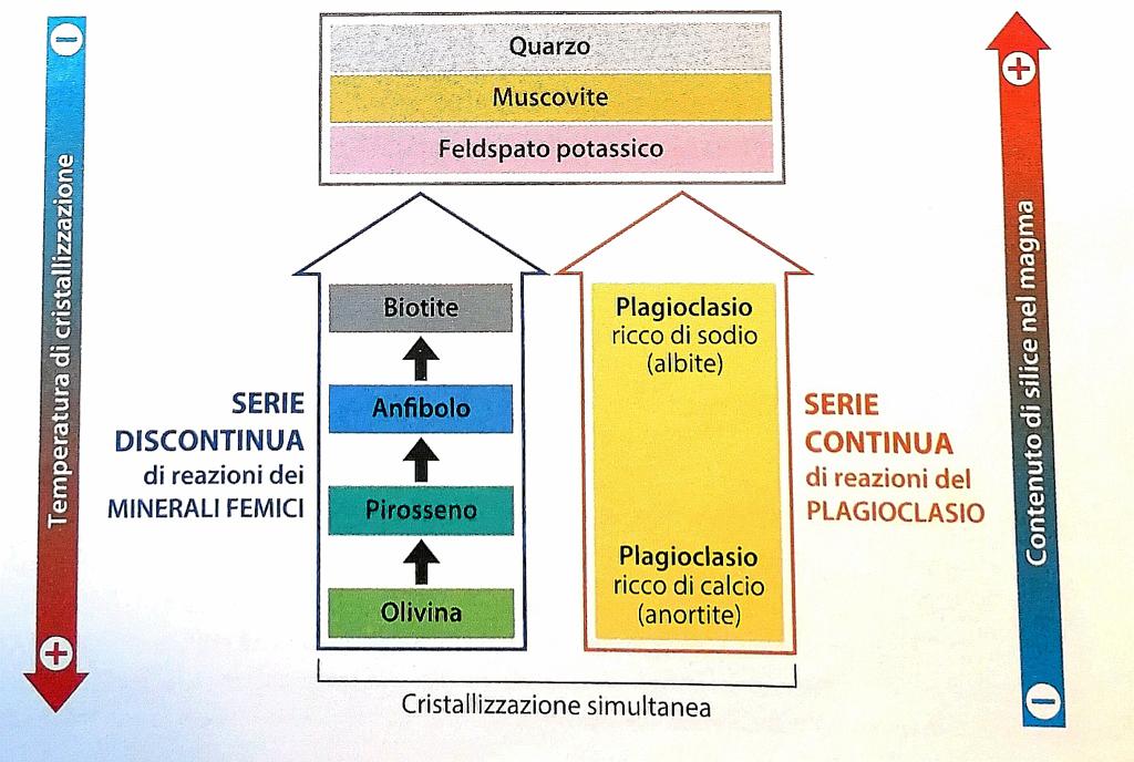 • Contemporaneamente alle reazioni della serie continua si svolgono, in modo del tutto indipendente, le reazioni della serie discontinua, con passaggio repentino da un minerale ad un altro, che portano alla separazione del fuso dei minerali femici. In un basalto, per esempio, il minerale che si forma per primo è l'olivina, silicato ricco di ferro e magnesio. Cristalli di olivina rimangono sparsi nel fuso per un certo intervallo di temperatura, al termine del quale reagiscono tutti con una parte del liquido per formare i pirosseni, silicati più ricchi di silicio e contenenti calcio, potassio e magnesio; anche questi ultimi, a temperatura inferiore, reagiscono con il liquido residuale per formare gli anfiboli, silicati contenenti acqua. E così via. Anche per la serie discontinua quanto più il fuso iniziale è acido, tanto più avanti si spinge la serie di reazioni, fino alla biotite, che è l'ultimo minerale che si può formare in tale serie.